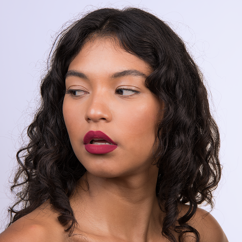 Fake News matte liquid lipstick is a cool dark fuchsia.